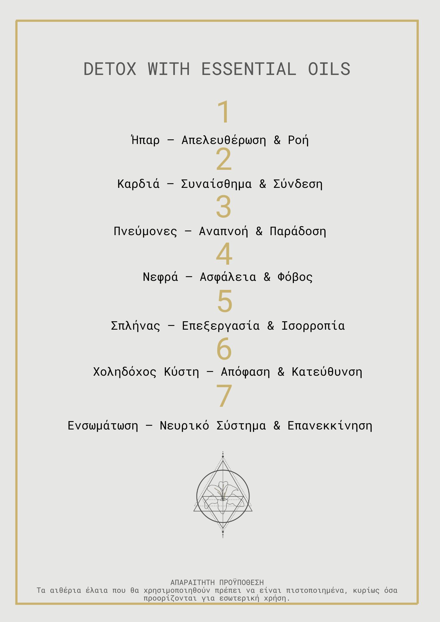 Το Detox Your System είναι ένα δομημένο σύστημα που δουλεύει σε βάθος με τα 7 βασικά όργανα του σώματος, συνδέοντας τη φυσιολογία με τη συναισθηματική και ενεργειακή κατάσταση. Σύμφωνα με την Παραδοσιακή Κινέζικη Ιατρική, κάθε όργανο συνδέεται με ένα συγκεκριμένο συναίσθημα και επηρεάζει άμεσα τη ροή της ενέργειας στο σώμα. Μέσα από στοχευμένες πρακτικές, αιθέρια έλαια και καθοδήγηση, ενεργοποιείται μια διαδικασία σταδιακής αποτοξίνωσης, όχι μόνο σωματικά, αλλά και συναισθηματικά.